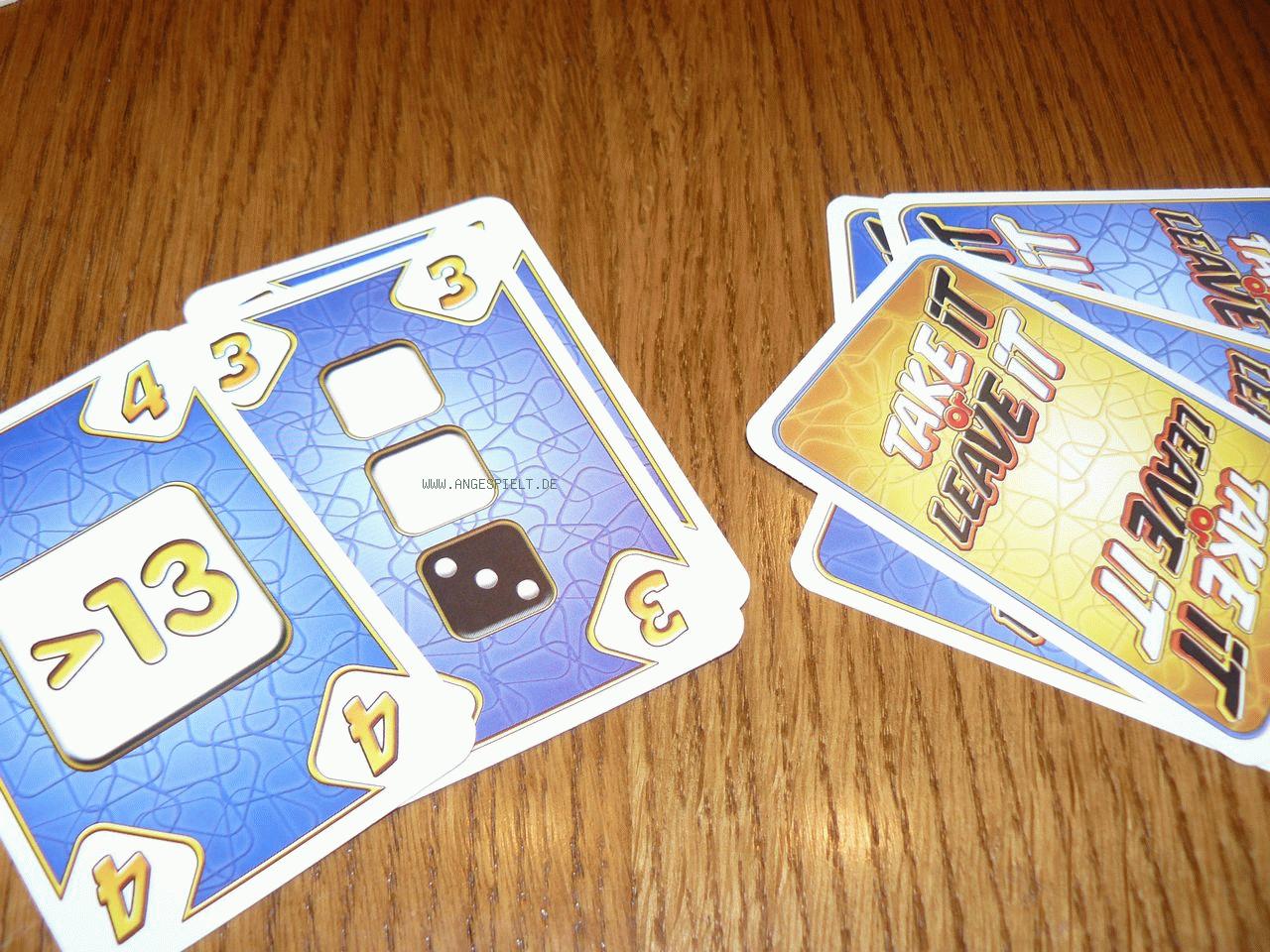 Die Symbolik der Karten ist leicht verständlich, die überschaubaren Regeln ermöglichen einen schnellen Einstieg. Und im Gegensatz zu anderen misslungenen Versuchen mancher Verlage in den letzten Jahren brauchbare Würfelspiele zu konstruieren, funktioniert Take it or Leave it tadellos. Die richtige Wahl der in der Auslage befindlichen Würfel, das Abwägen ob ein roter Würfel wirklich nützlich ist, das Spekulieren auf das Passen (und damit verbundene Aussteigen aus der aktuellen Runde) der Mitspieler und der wohlplatzierte Einsatz der Aktionskarten lassen den Spielern genügend Handlungsspielraum, sodass das Ergebnis kein reines Zufallsprodukt wird.