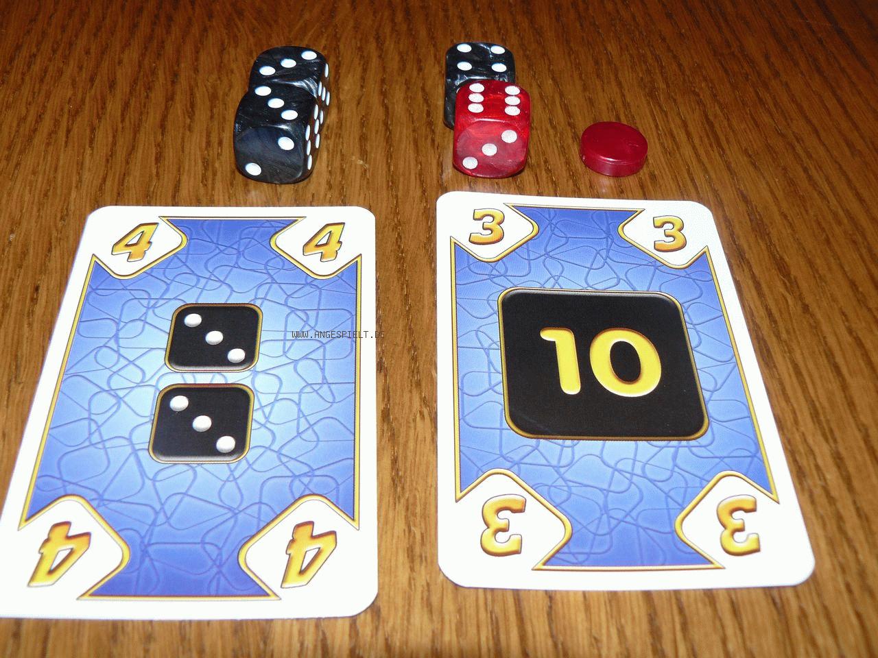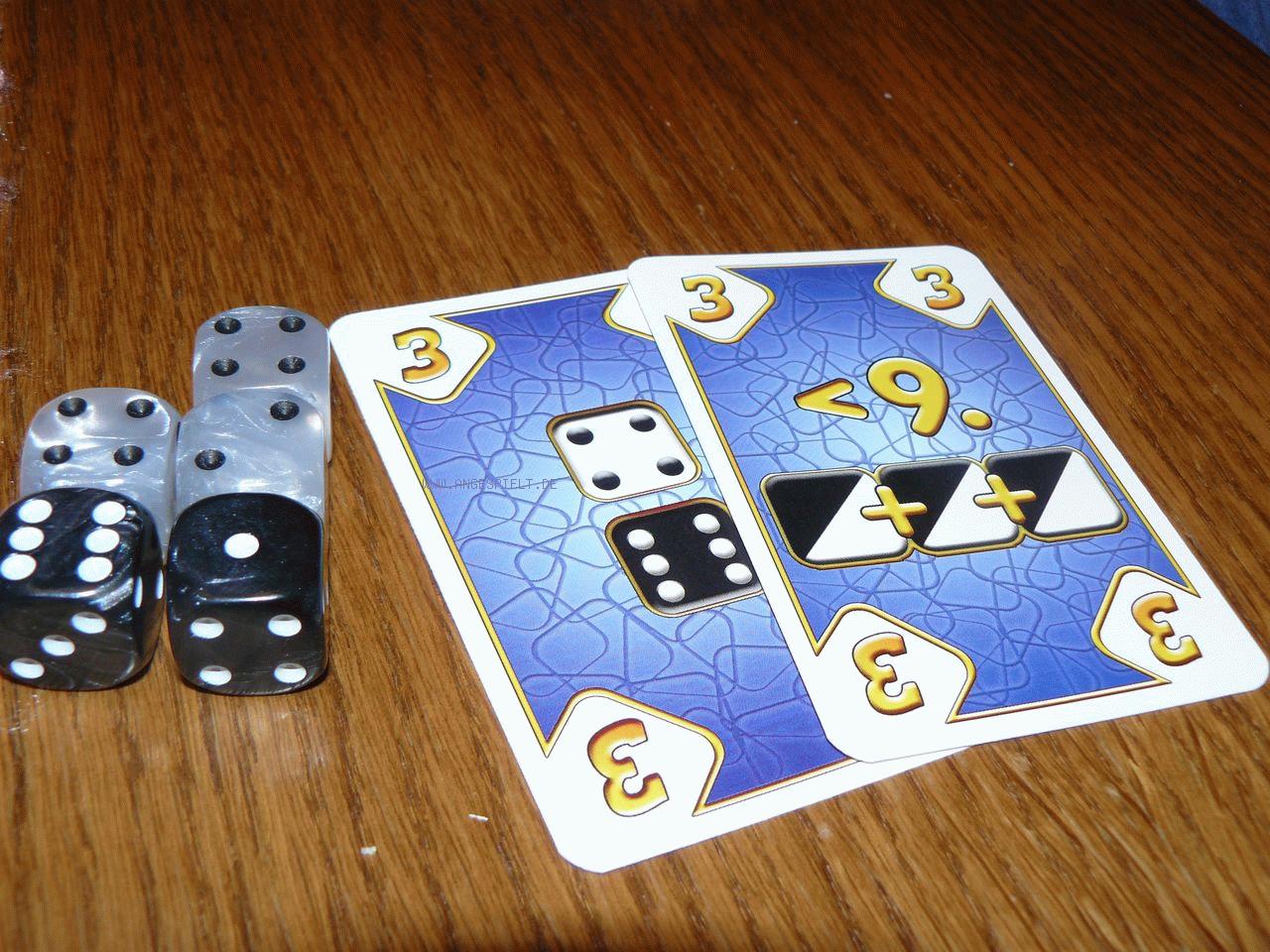 In jeder Runde wird eine spielerzahlabhängige Menge Würfel vom Startspieler in den Würfelteller geworfen. Neben einer gleichen Anzahl weißer und schwarzer Würfel gibt es auch ein oder zwei rote, die als Joker fungieren, aber gleichzeitig Minuspunkte bringen. Jeder Spieler erhält neben einer Aktionskarte vier Aufträge. Diese lauten beispielsweise „drei beliebige Würfel, deren Summe kleiner als 7 ist“, „beliebig viele schwarze Würfel mit der Summe 15“ oder „eine schwarze 5, eine weiße 1 und eine 6 beliebiger Farbe“.