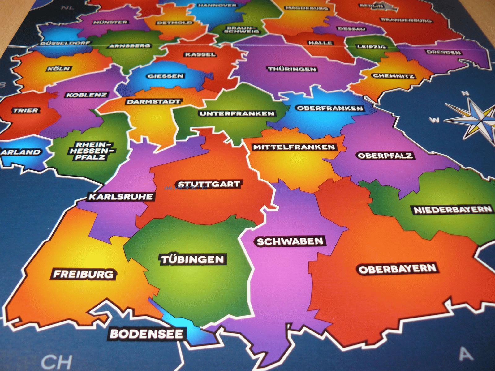 Deutschland ist in 44 Regionen aufgeteilt, die sich in fünf verschiedenen Farben auch auf den Regionenkarten wiederfinden. Jeder Spieler erhält zu Beginn zehn Karten, die er nacheinander auf seinem Kartenhalter platzieren muss. Reihum wird dann jeweils eine eigene Karte mit einer der drei offen ausliegenden ausgetauscht. Dies geht solange, bis eine zusammenhängende Reiseroute entstanden ist und die zehn Karten in der vorliegenden Reihenfolge besucht werden können.