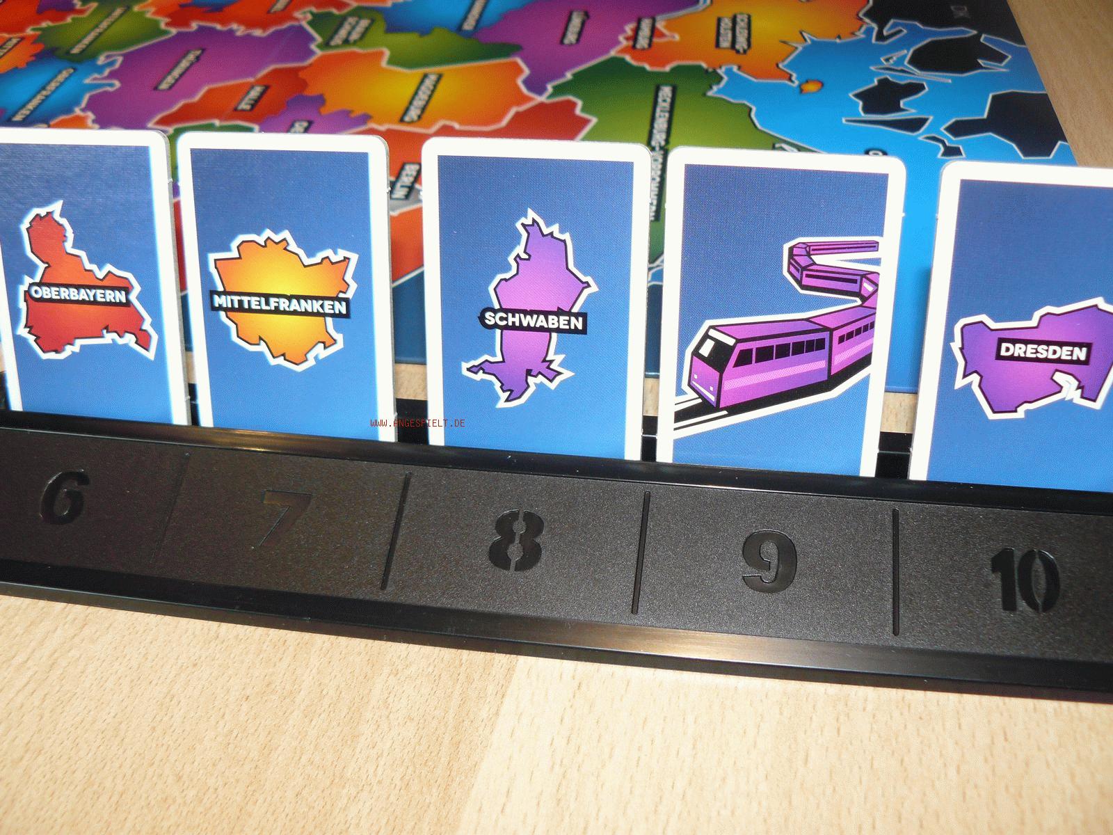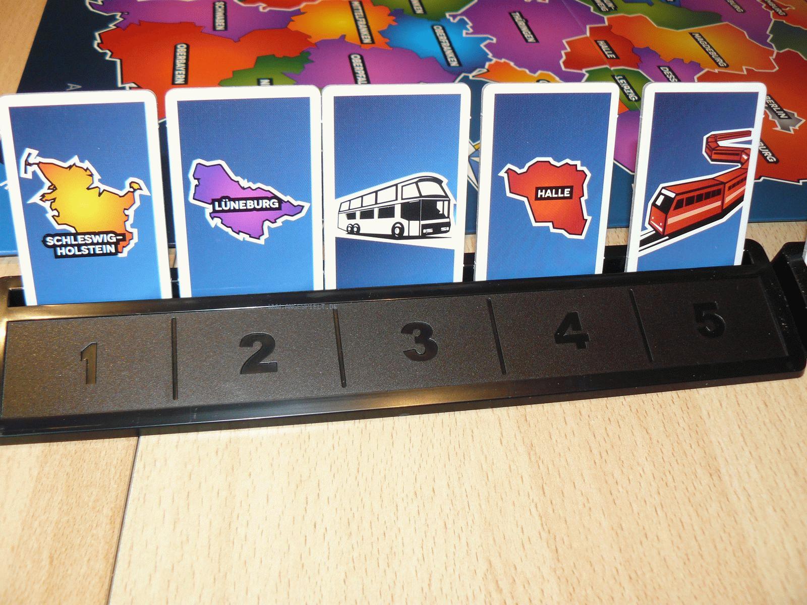 Neben Regionen gibt es auch Hilfskarten: Bus und Bahn. Busse fungieren als Joker und ersetzen beliebige Regionen, Bahnen verbinden zwei Gebiete der gleichen Farbe miteinander. Eine Reihe Braunschweig (grün) - grüne Bahn - Tübingen (grün) - Bus - Mittelfranken (gelb) wäre also eine legitime Reiseroute.