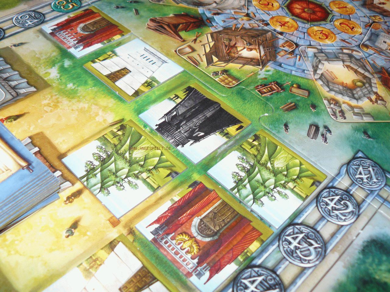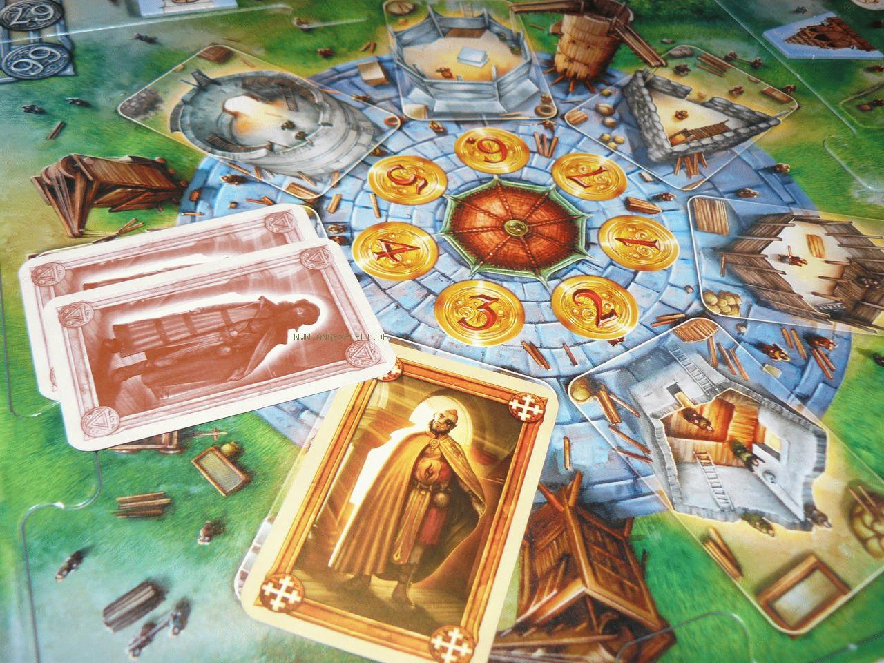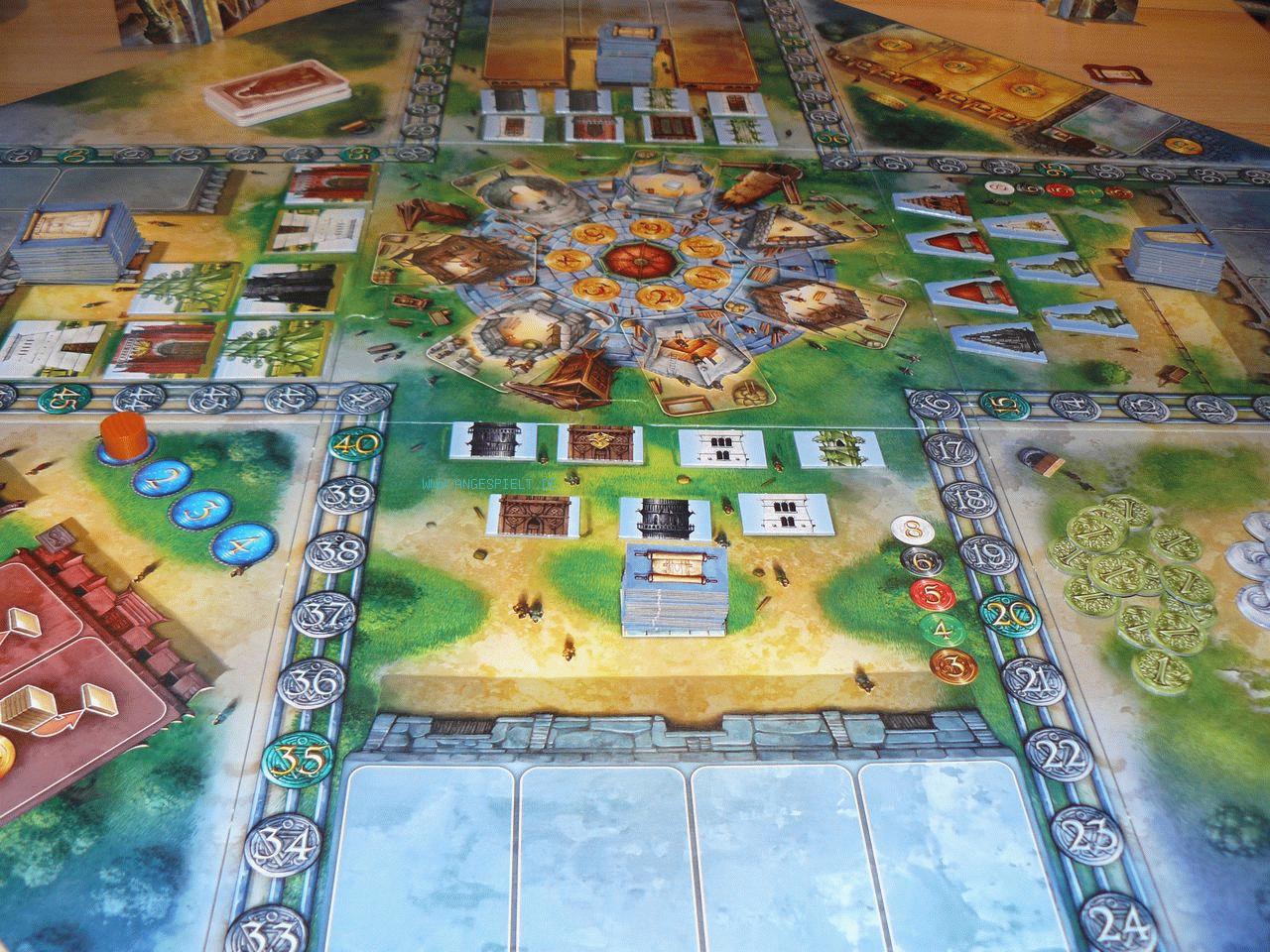 Um gesammelte Teile zu verbauen, muss eine Karte in das Rondell der Spielplanmitte gespielt werden –natürlich unter Beachtung des Farbzwangs. Das gewählte Feld gibt nicht nur den zu entrichtenden Preis vor, sondern auch die Anzahl der verbaubaren Teile. Diese dürfen für neue Türme verwendet oder in bereits bestehende eingebaut werden –und liefern sofort Siegpunkte.