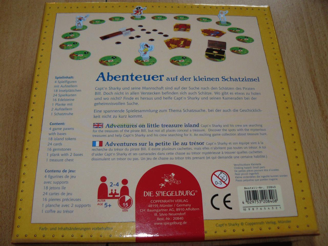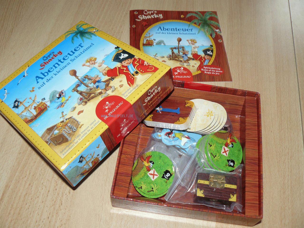 Capt’n Sharky und seine Mannschaft haben nach langer Suche die Schatzinsel des berüchtigten Piraten Bill entdeckt, der dort Schatzkisten mit wertvollen Edelsteine vergraben hat. Wie beim großen Brettspiel-Bruder müssen die Spieler auch bei der kleinen Schatzinsel Edelsteine suchen und zum Piratenschiff zurück bringen.