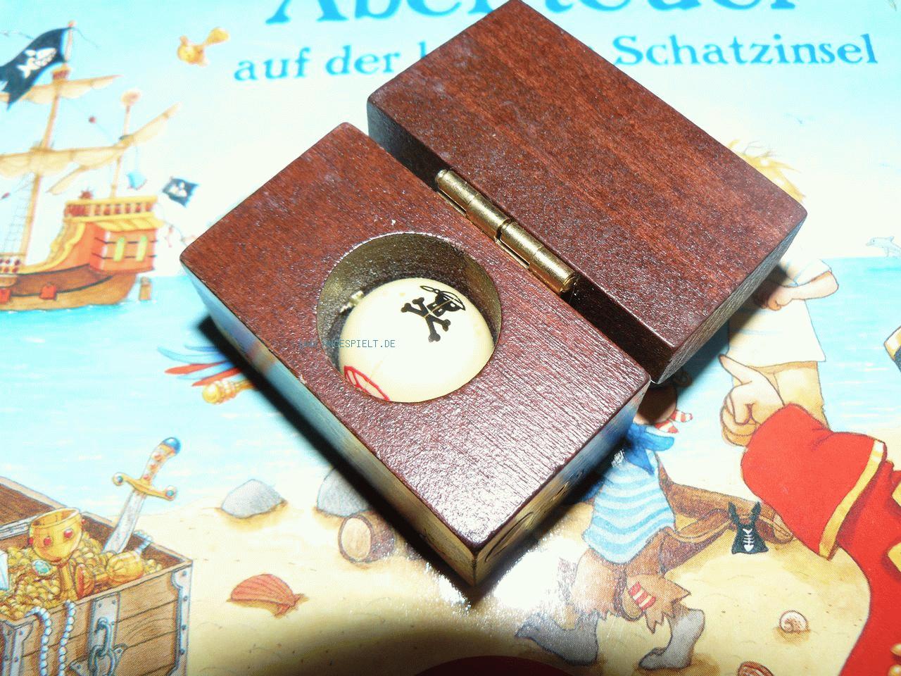 Anstelle eines großen Spielplans besteht die kleine Schatzinsel aus 14 Plättchen, die in einer langen Reihe (bzw. im Kreis) ausgelegt und von den Piratenfiguren der Spieler abgelaufen werden. Reihum werden Bewegungskarten ausgespielt, entsprechend weit gezogen (wobei bereits besetzte Felder übersprungen werden) und das Plättchen mit einer Schatztruhe „abgesucht“. Plättchen mit Schätzen sind magnetisch und sorgen dafür, dass die an einer Achse aufgehängte Kugel im Inneren der Truhe entsprechend ausgerichtet wird. Zeigt die Kiste ein oder zwei Edelsteine, werden diese auf das Feld gelegt.