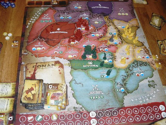 Beim Spiel fällt dies allerdings kaum auf, da die Spieler doch mehr mit dem Sammeln von Siegpunkten beschäftigt sind und den Erobern neuer Gebiete. Diese Eroberungen sind aufwendig und selten in nur einem Zug zu bewältigen, sodass es eher selten zu Auseinandersetzungen zwischen zwei Spielern kommt. Denn wenn eine feindliche Armee besiegt ist, muss anschließend das nun freie Gebiet auch noch unterworfen werden. Das kostet Zeit, die meist knapp ist. Vor allem dann, wenn der Conan-Spieler diesen zielstrebig zum Obelisken bewegt. Ob er das tun sollte hängt davon ab, ob er ihn eher zur Unterstützung bei einem Kampf benötigt, oder doch lieber verhindern will, dass die Mitspieler zu viele Abenteuermarker sammeln.