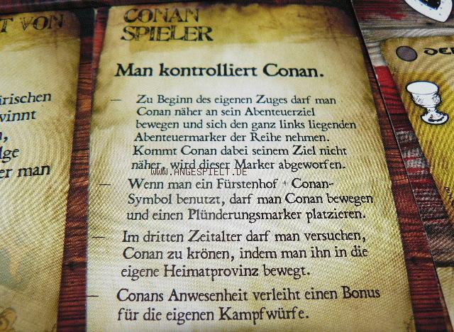 Zu Beginn eines Zeitalters wird unter den Spielern mittels Strategiekarten und Gebotsmarker die Rolle des Conan-Spielers versteigert. Dieser darf zu Beginn seiner Züge zusätzlich Conan bewegen, der dabei eine Spur der Verwüstung in Form von Plünderungsmarkern zurücklässt. Nimmt Conan an einer Schlacht teil, unterstützt er den Conan-Spieler erheblich. Erreicht er das Zielfeld seiner Aufgabe bevor der letzte Abenteuermarker genommen wird, hat er sein Abenteuer bestanden und beschert seinem Teilzeit-Besitzer einen zusätzlichen Marker, der sogar verdeckt aus dem Vorrat gezogen werden darf.