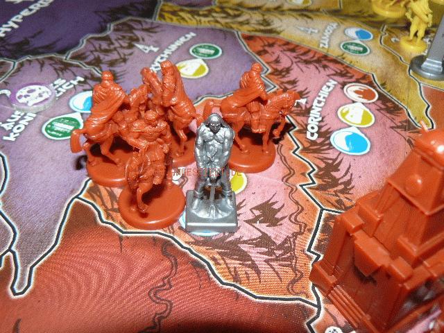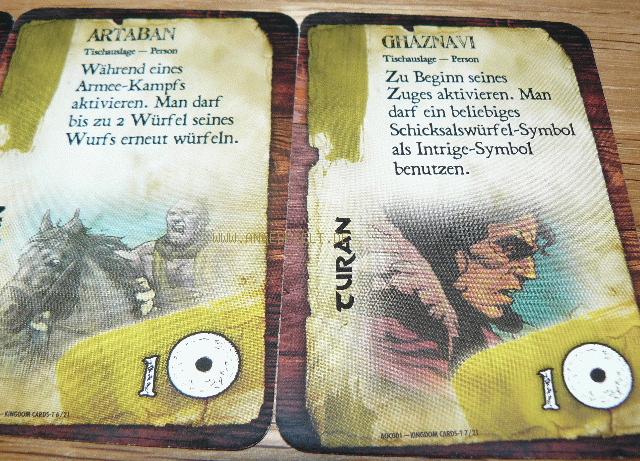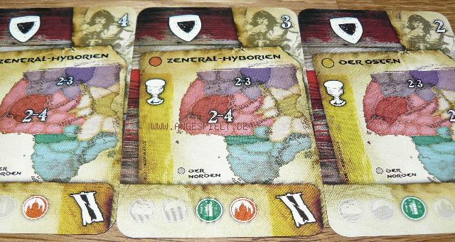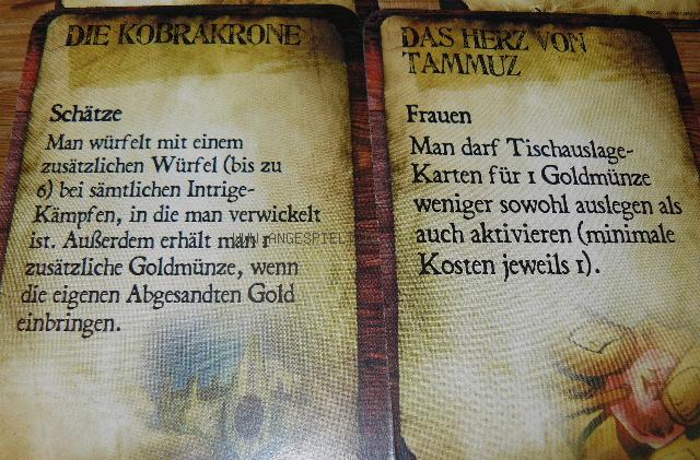 Neben diesen strukturellen Schwächen besitzt das Regelheft aber auch Stärken, darunter eine stimmige Atmosphäre. Auch sind uns keine inhaltlichen Fehler aufgefallen, was ebenfalls für gute Lektoratsarbeit des Verlags spricht. Apropos Atmosphäre: Die im Spiel befindlichen Artefakte „Schwert von Atlantis“, „Kobrakrone“ und „Herz von Tammuz“ sollten nicht unterschätzt werden, da sie mit ihren spezifischen Stärken das Gleichgewicht zu Gunsten ihrer Nutzer verändern. Wer beispielsweise das Schwert besitzt, sollte sich auf Invasionen konzentrieren, wohingegen der Kroneneigner besser seine Gesandten zur Provinzübernahme einsetzt.
