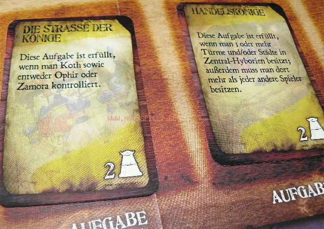 Siegpunkte erhalten die Spieler durch das Sammeln von Abenteuermarkern und das Erfüllen ausliegender Auftragskarten. Abenteuermarker können allerdings auch wieder gegen Gold oder Magiepunkte eingetauscht werden. Die Marker sind Bestandteil von Conans Abenteuern, von denen er in jedem Zeitalter mehrere bestreiten muss.