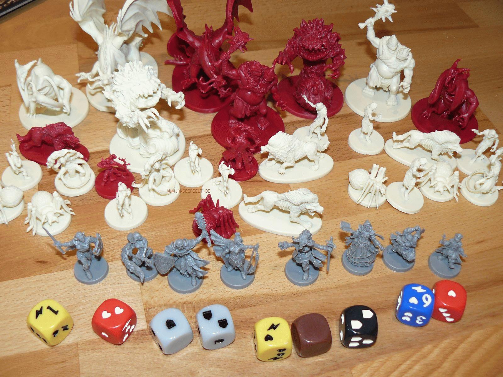 Auf den ersten Blick mag man etwas enttäuscht sein, da die neue Ausgabe deutlich kleiner ausfällt, als man es von den Fantasy-Flight-Monsterpackungen sonst gewöhnt ist. Entsprechend weniger passt natürlich auch hinein: weniger Marker, weniger Karten, weniger Spielplanteile und nur noch halb so viele Miniaturen. Diese sind etwas detaillierter als früher, und auch weniger verbogen. Die Anzahl Kreaturen ist allerdings völlig ausreichend, um auch einer größeren Spielergruppe ordentlich einzuheizen.