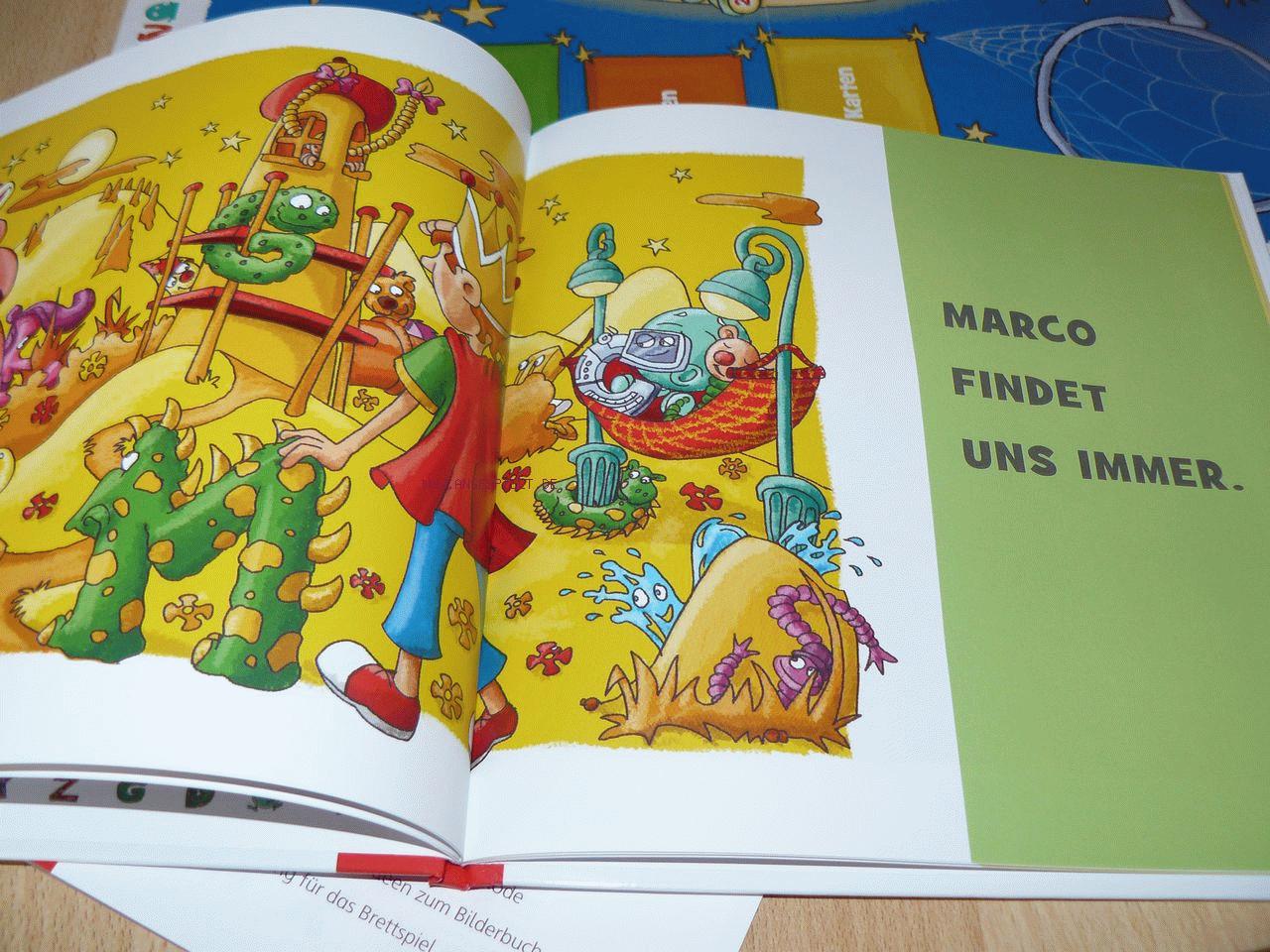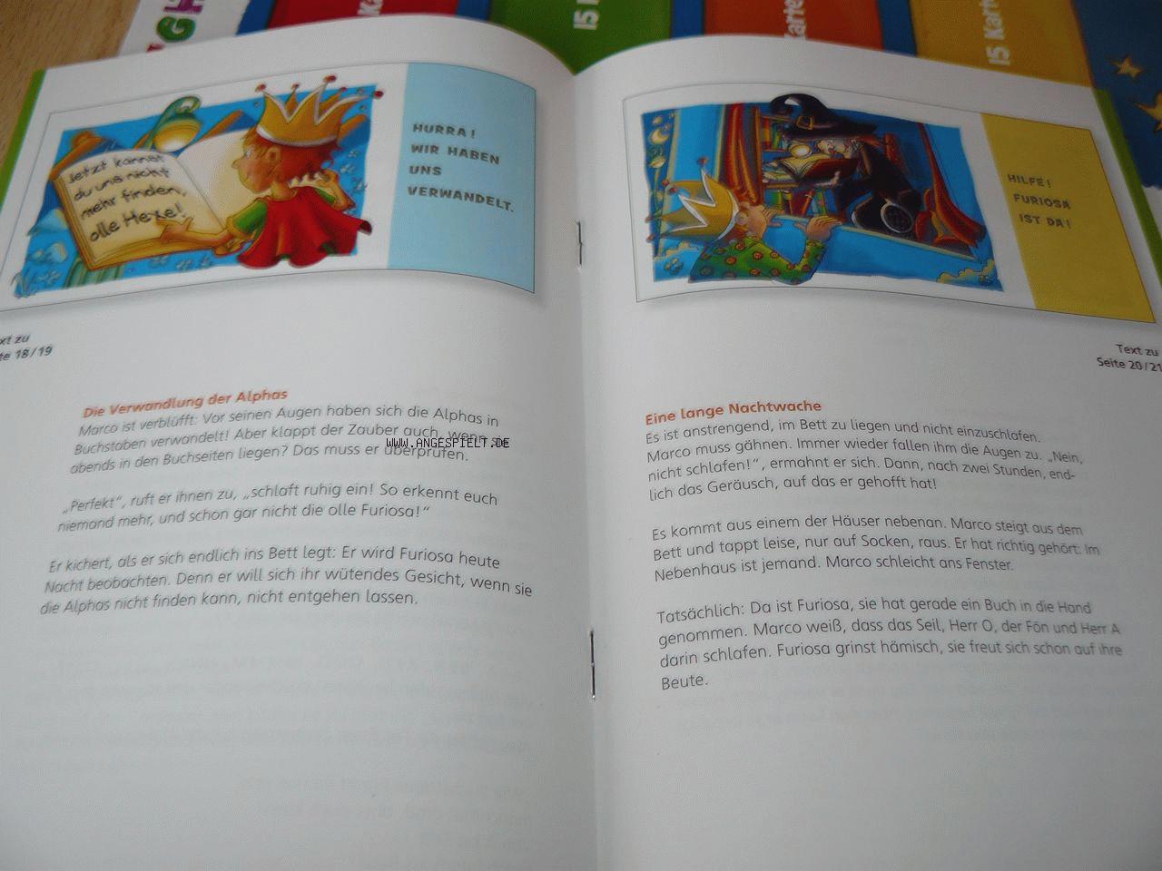 Zum Lieferumfang gehören ein Bilderbuch plus Eltern-Vorleseheft analog der ersten Box, fünf Alpha-Figuren für das Brettspiel sowie drei Kartensätze (=Schwierigkeitsstufen) mit je ca. 80 Karten. Zur Einstimmung empfiehlt es sich, die Geschichte (mehrfach) zu lesen, um den Alphas im Anschluss daran zu helfen, per Brettspiel den Weg in das Buch zu finden.