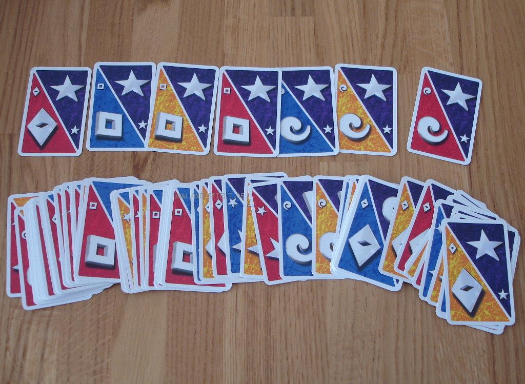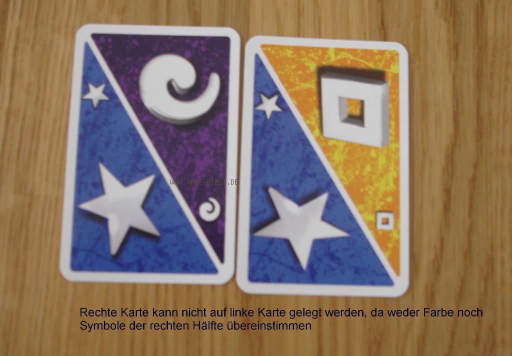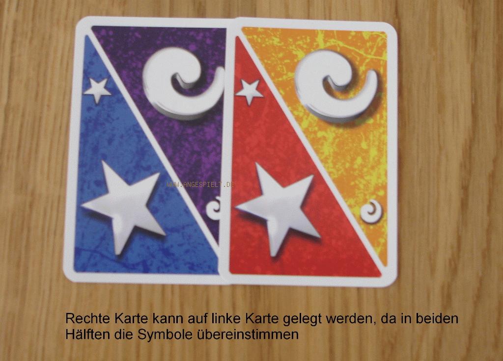 Nun gilt es, möglichst schnell seine Karten abzulegen. Die Karten sind in zwei Hälften geteilt, wobei jede Hälfte eine bestimmte Farbe und ein bestimmtes Symbol zeigt. Karten können nur auf den Ablagestapel gelegt werden, sofern mindestens eine Übereinstimmung je Hälfte vorliegt. Wenn also eine Kartenhälfte in Symbol und Farbe mit der obersten Karte des Ablagestapels übereinstimmt, aber die andere Hälfte keine Übereinstimmung aufweist, so kann der Spieler die Karte nicht ablegen.