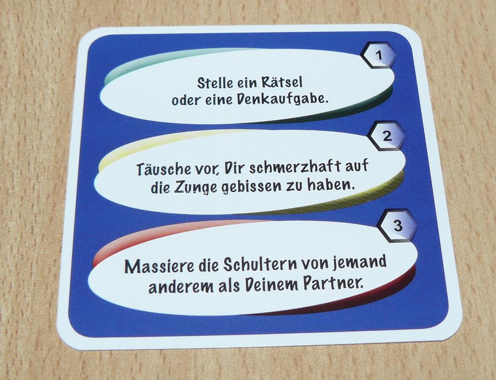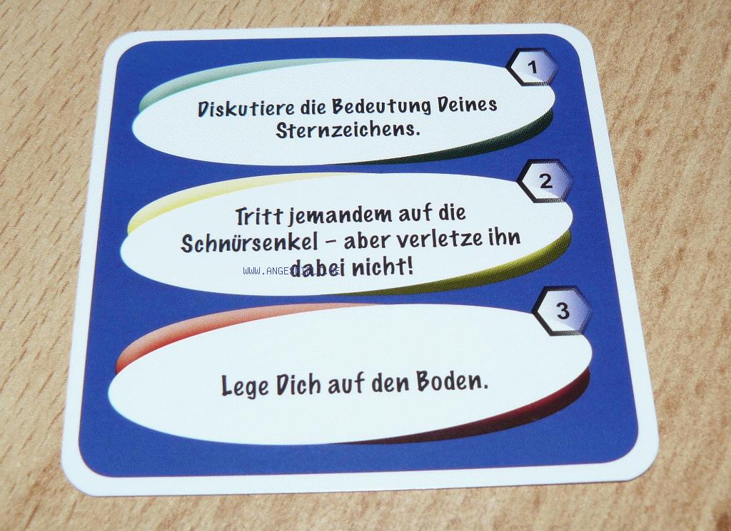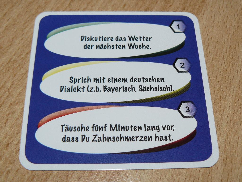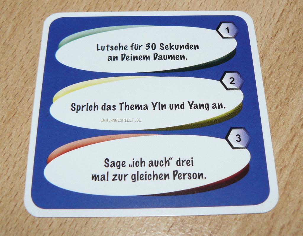Einige Aufgaben sind auch gar nicht lösbar. Auf welchen Schnürsenkel soll denn getreten werden, wenn niemand Straßenschuhe trägt? Was macht jemand, der keinen Lieblingsverein hat, zu diesem aber Stellung beziehen soll? Dass Karten deshalb getauscht werden müssen, kommt häufiger vor. Dieser Anker sollte auch benutzt werden, wenn ein Spieler die Aufgabe nicht versteht. In einer unserer Partien konnte beispielsweise niemand erklären was denn mit „Daumenkrieg“ gemeint sei, die meisten hatten diesen Begriff noch nie zuvor gehört.