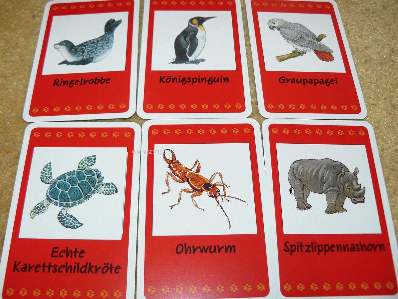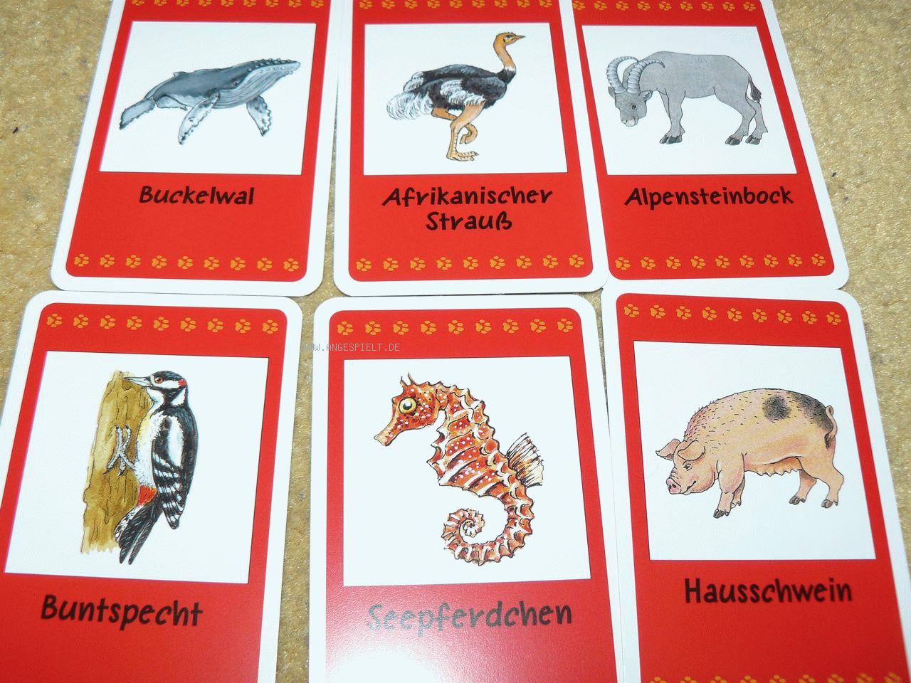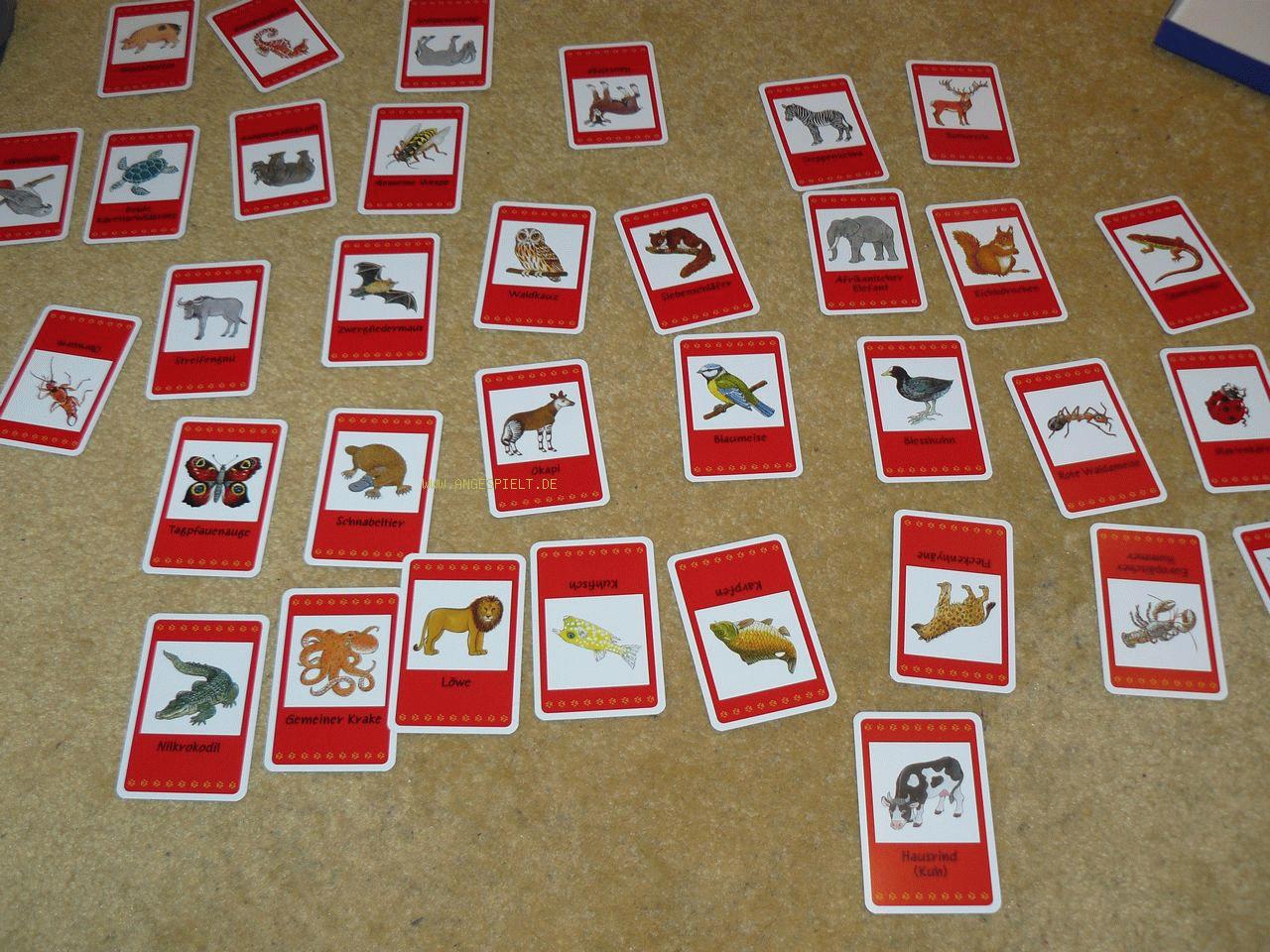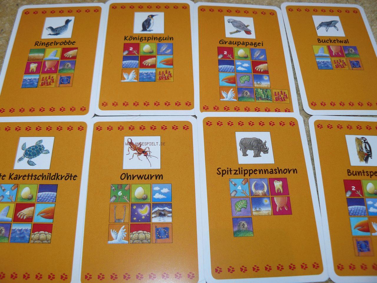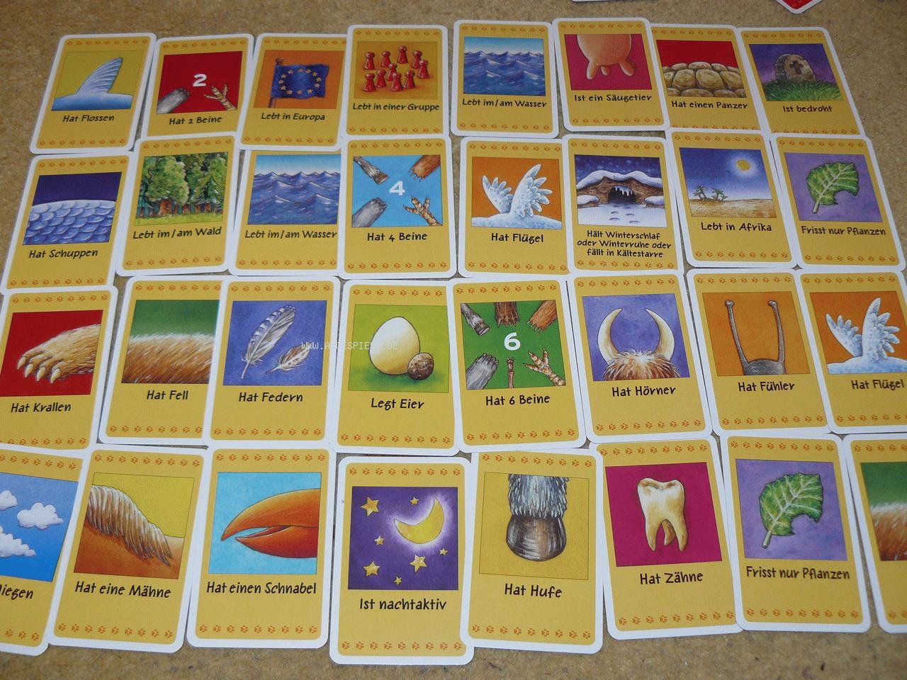 40 Tierkarten zeigen auf ihren roten Vorderseiten eine Abbildung und den Namen des Tieres, auf den orangefarbenen Rückseiten die zutreffenden Merkmale. Von den 32 gelben Merkmalskarten erhält jeder Spieler drei auf die Hand. Fünf Tiere werden offen ausgelegt.