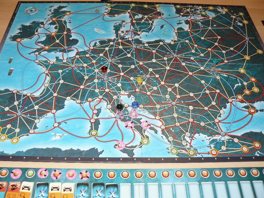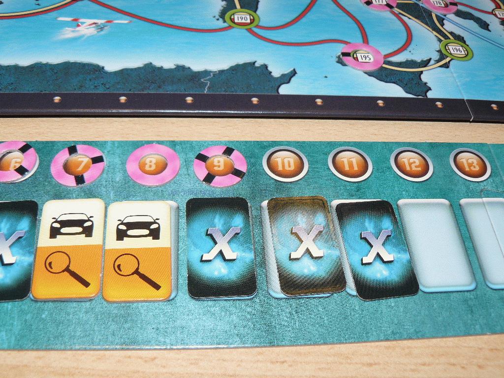 Auf einer Ticketleiste legt er das genutzte Plättchen ab und notiert sich auf einem speziellen Zettel hinter seinem Sichtschirm die Nummer der neuen Stadt. Zu seinen möglichen Sonderzügen zählt der geheime Zug mit unbekanntem Verkehrsmittel, sowie der Doppelzug. In beiden Fällen müssen drei Tickets mit dem gleichen Sonderaktionssymbol abgegeben werden –sie werden sogar aus dem Spiel entfernt.