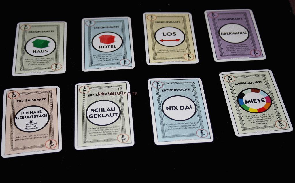 Mit den Ereigniskarten ist es möglich Geld von den Mitspieler zu fordern (z.B. Miete, Geburtsgeschenke, etc.) oder Karten von den Mitspielern zu stehlen. Es gibt aber auch Häuser und Hotels, sowie Abwehr-Karten.