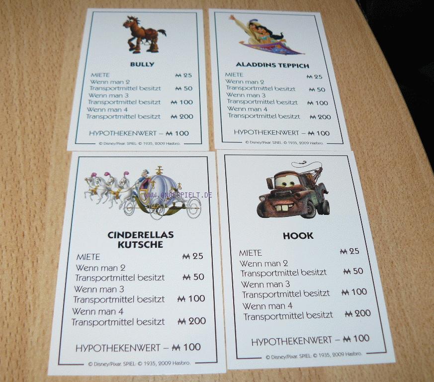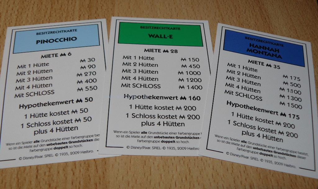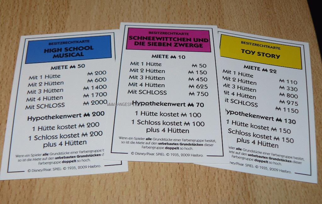 Optisch sind Spielplan, Grundstücke und Karten auf Disney-Hochglanz poliert und mit niedlichen Hütten und Cinderella-Schlössern ausgestattet worden. Da macht das Spielen nicht nur Kindern Freude, auch Erwachsene finden Gefallen daran. Für deutsche Verhältnisse eher ungewöhnlich ist die Auswahl der Grundstücksthemen. Parkstraße und Schlossallee wurden mit den in den USA erfolgreichen „Hannah Montana“ und „Highschool Muscial” belegt, die hierzulande weit weniger bekannt sind. Auch sonst sind Auswahl und Verteilung recht willkürlich geraten. Meist entspricht eine Straße einem Film, die Bahnhöfe einzelnen Autos aus „Cars“. Weshalb Tinkerbell aber zusätzlich zur Sonderfigur auch noch mit einem separaten Grundstück bedacht wurde, erschließt sich uns nicht.