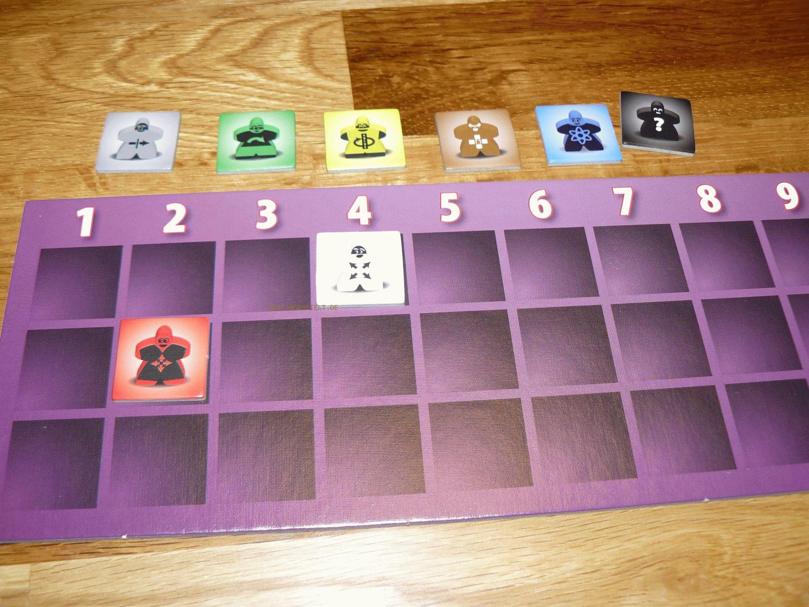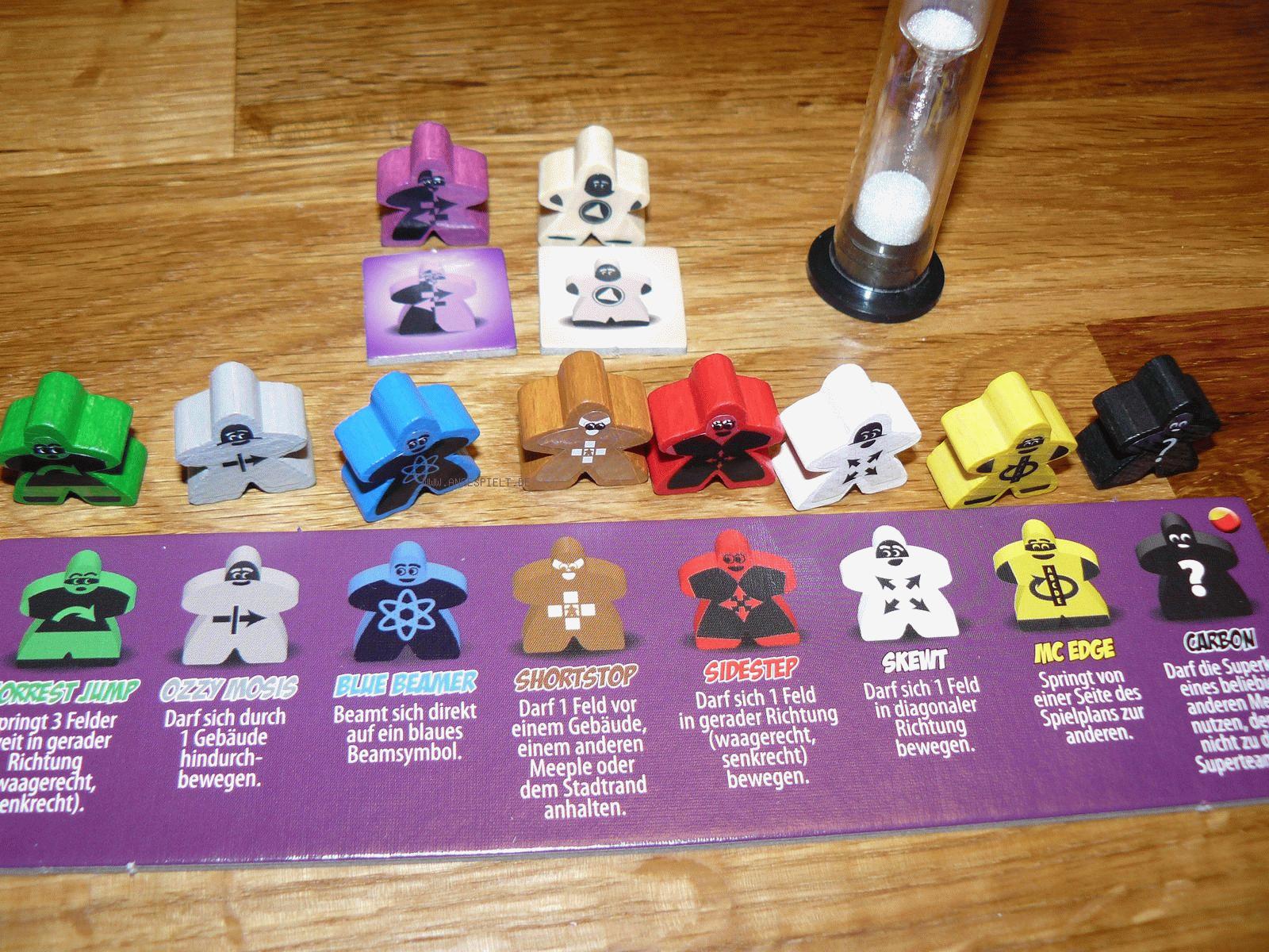 Jeder Spieler überlegt für sich, welche Figur sich wie bewegen müsste und markiert auf seinem Planungsbrett die Anzahl der Bewegungen, die bis zu drei Meeples nacheinander durchführen dürfen. Wer die schnellste Lösung findet, darf seinen Sieger-Meeple in sein „Super-Team“ befördern. Er ist jetzt quasi Mitglied der Meeple-Rächer, der Justmeeple League, oder der X-Meeples, ganz wie man es sehen mag. Allerdings hat dies auch einen Nachteil, denn dieser Meeple darf fortan vom Spieler nicht mehr benutzt werden. Trotzdem ist dieser Schritt erforderlich, denn es gewinnt, wer sein Super-Team auf sechs Mitglieder aufgestockt hat. Die Meeples im Einzelnen: