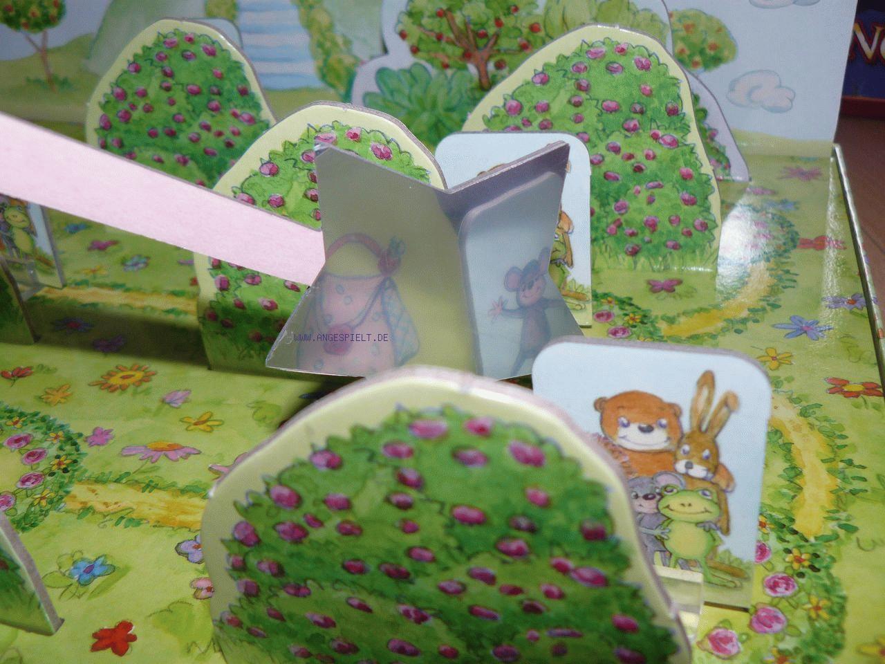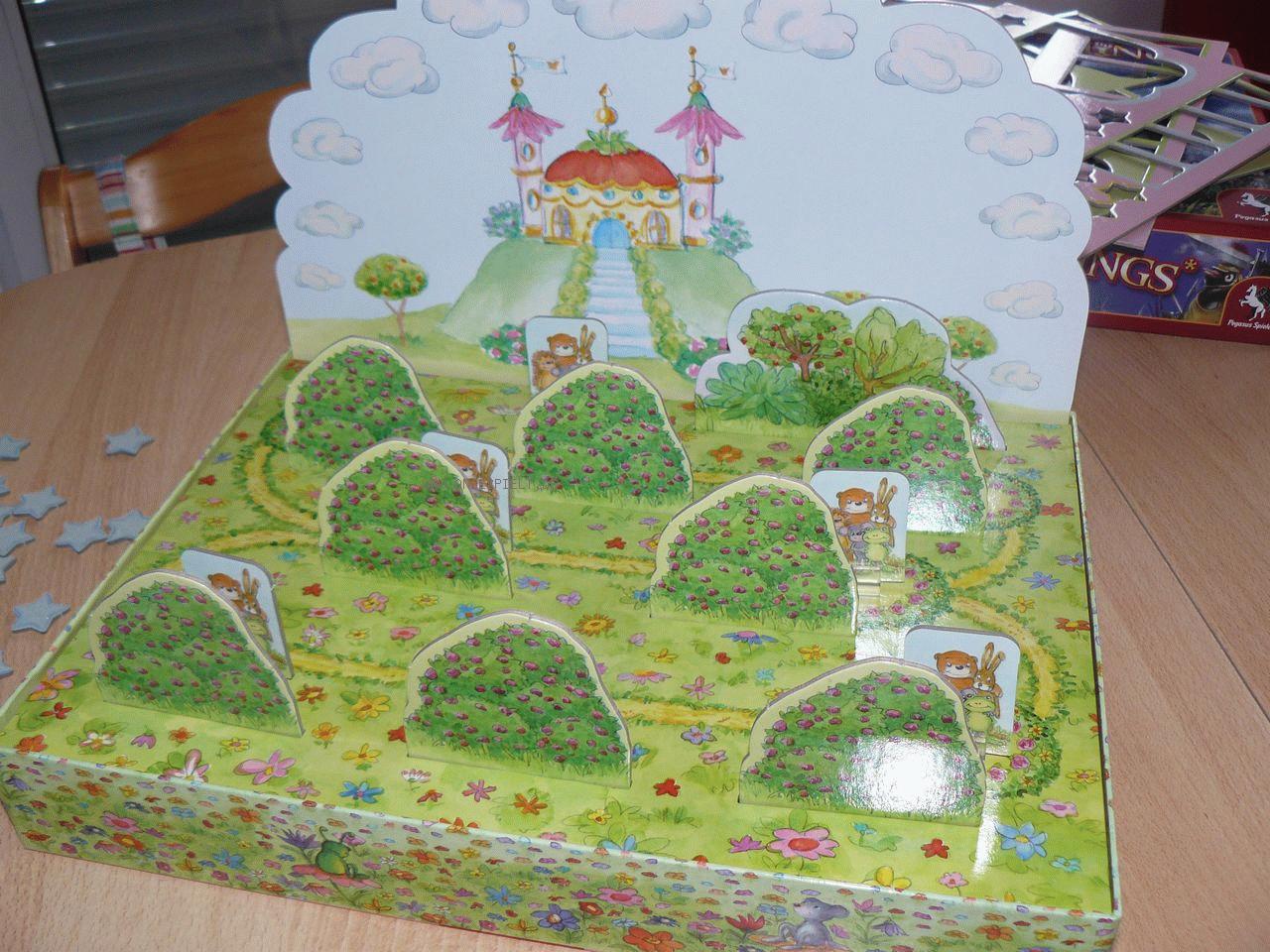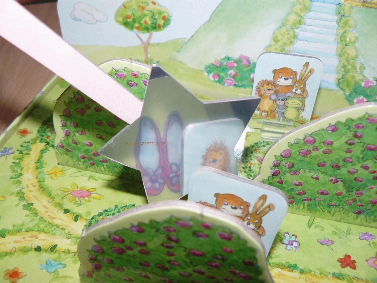 Beim großen Feenball müssen sich die Kinder gleich drei verschiedene Dinge merken: Hinter welchem Busch befindet sich welches Kostümteil, welche Figur ist welches Tier und wo liegen welche Sterne? Das ist viel verlangt für Fünfjährige, funktioniert aber zumindest bei den Karten auf dem Spielbrett sehr gut.