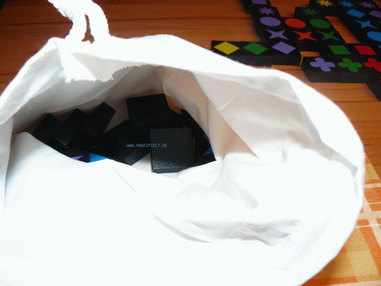 Jeder Spieler erhält sechs Steine aus einem schwarzen Stoffsäckchen. Reihum werden Steine angelegt und genauso viele wieder nachgezogen. Alternativ dürfen Steine auch in den Sack zurückgelegt und neu gezogen werden.