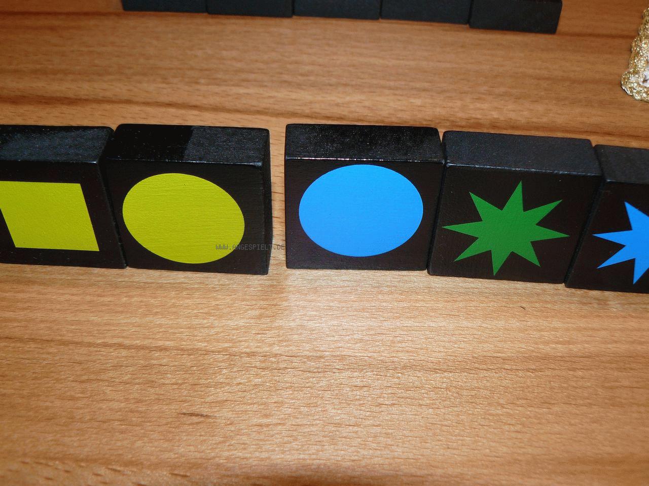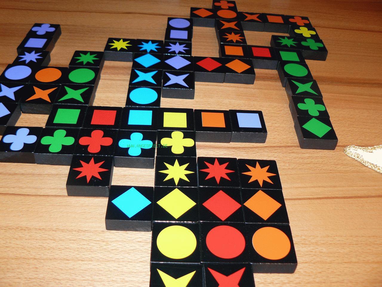Beim Anlegen müssen nur wenige Regeln beachtet werden: Alle Steine müssen in dieselbe Reihe gelegt werden und entweder in Farbe oder Form übereinstimmen. Gleichzeitig darf kein Farbmuster doppelt vorkommen, sodass eine Reihe maximal aus sechs Steinen bestehen kann (=sechs Formen einer Farbe oder sechs Farben einer Form). Dafür gibt es sofort Punkte, die separat notiert werden. Und zwar so viele, wie die Reihe nun Steine besitzt. Werden durch die neuen Steine gleich mehrere Reihen erweitert (sprich: Zeilen und Spalten an Kreuzungspunkten), gibt es entsprechend mehrfache Wertungen. Eine vollständige 6er-Reihe heißt übrigens „Qwirkle“ und liefert nochmals 6 Bonuspunkte.