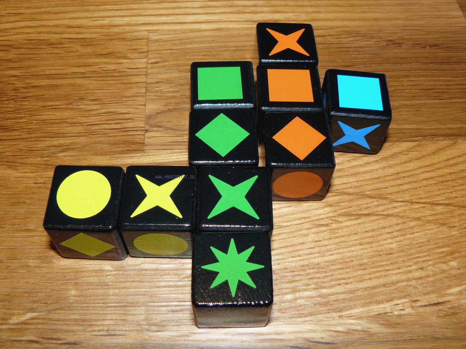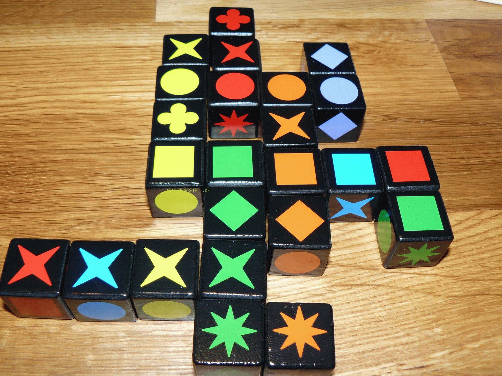 Die Würfel besitzen in etwa die gleiche Masse wie die großen Qwirkle-Steine, haben also eine etwas geringere Kantenlänge. Sie wirken optisch wie haptisch gleich, was aber auch einen traurigen Nachteil hat: Das Orange ist noch immer viel zu dunkel und wird bei schlechten Lichtverhältnissen leicht mit Rot verwechselt.