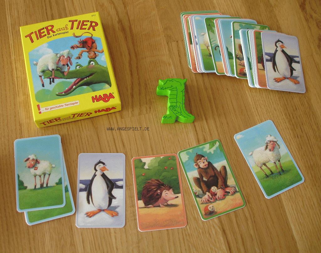 In zwei sehr unterschiedlichen Varianten werden in Tier auf Tier Das Kartenspiel Tierkinder-Karten auf einem (Holz-)Krokodil gestapelt.