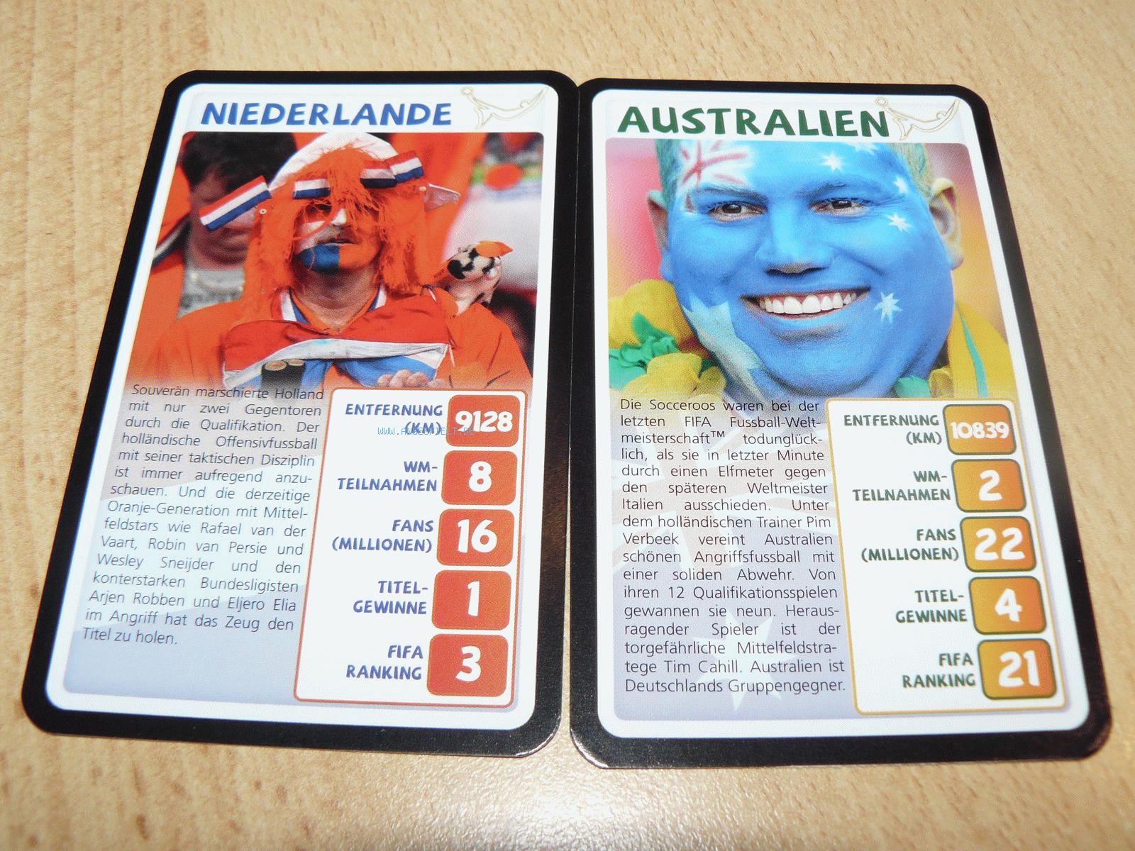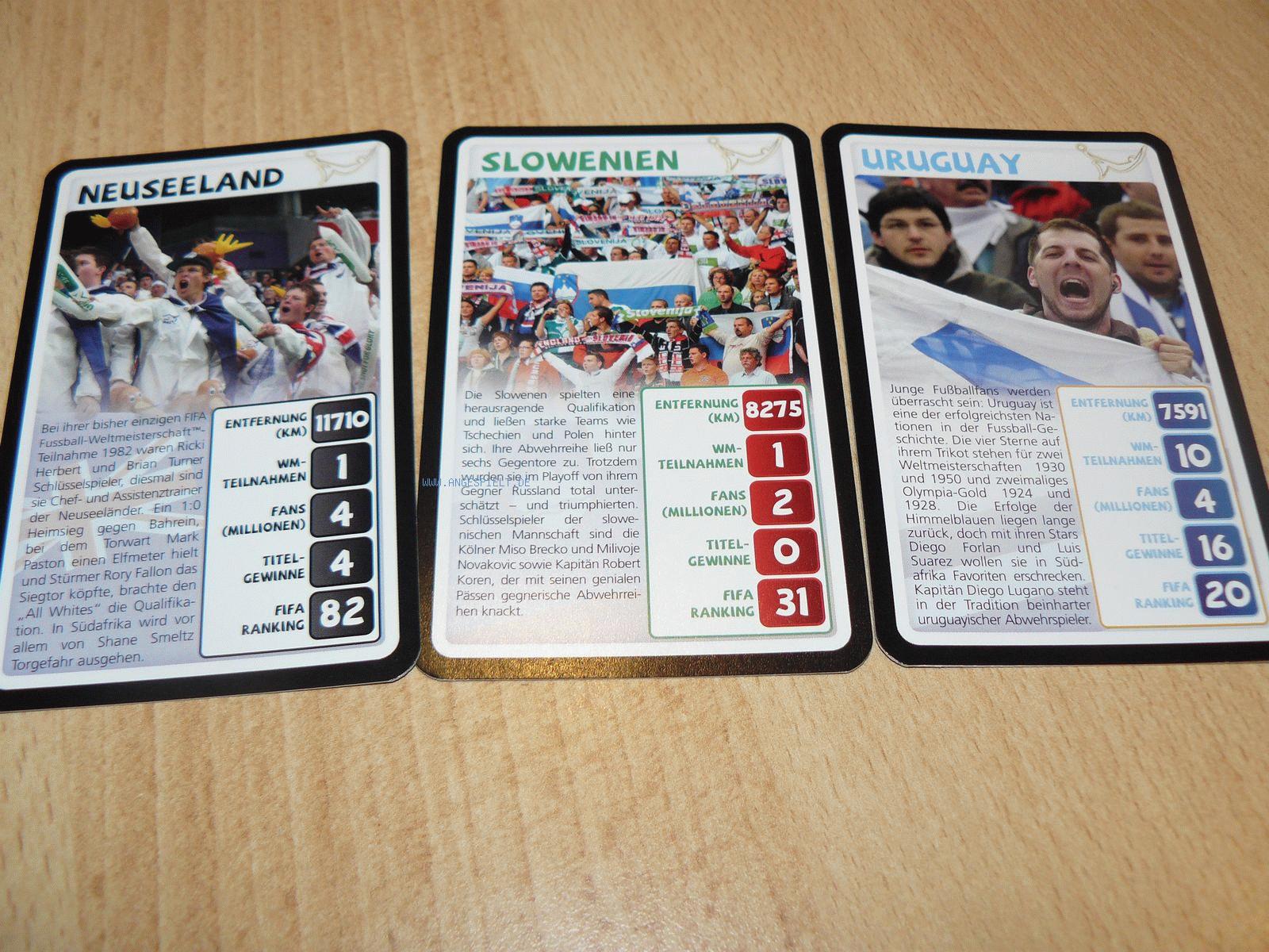 Mit „Fans“ ist die Einwohnerzahl des jeweiligen Landes gemeint, denn hier gelten selbstverständlich alle als Fans der eigenen Mannschaft. Warum auch nicht, schließlich sind wir ja sogar Papst. Beim "FIFA-Ranking" handelt es sich aber ganz sicher nur um eine Momentaufnahme, die spätestens nach der WM längst wieder vergessen ist. Apropos Fans: Diese sind auch auf den Spielkarten selbst zu sehen. Anstelle von Spielern oder landestypischen Merkmalen. Schade eigentlich.
