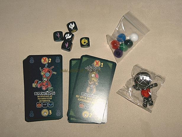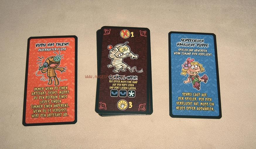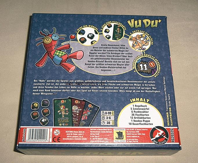 Arme verschränkt halten, gackern wie ein Huhn, auf einem Bein stehen, laut lachen etc. Das und vergleichbarer Blödsinn sind die Flüche, die ein Fluchopfer über sich ergehen lassen muss. Und damit dürfte auch klar sein, dass Vudu ein reines Party- und Kinderspiel ist, bei dem sich die Spieler zum Deppen machen. Natürlich sind alle „Flüche“ harmloser Quatsch, und daher eignet sich das Spiel in der Tat nur für Kinder und (angetrunkene) Partylöwen. Aber selbst bei diesem Klientel macht Vudu nur ab und zu in der richtigen Stimmung Spaß. Der Wiederspielreiz ist gering, und alle Spieler, die mit Partyspielen allgemein nichts anfangen können, dürften um Vudu ohnehin einen großen Bogen machen. Knallhart ausgedrückt: Das Spiel ist einfach blöd. Wer Blödeleien mag, kann Vudu unter Umständen etwas Gefallen abgewinnen. Alle anderen Spielertypen können damit jedoch überhaupt nichts anfangen.