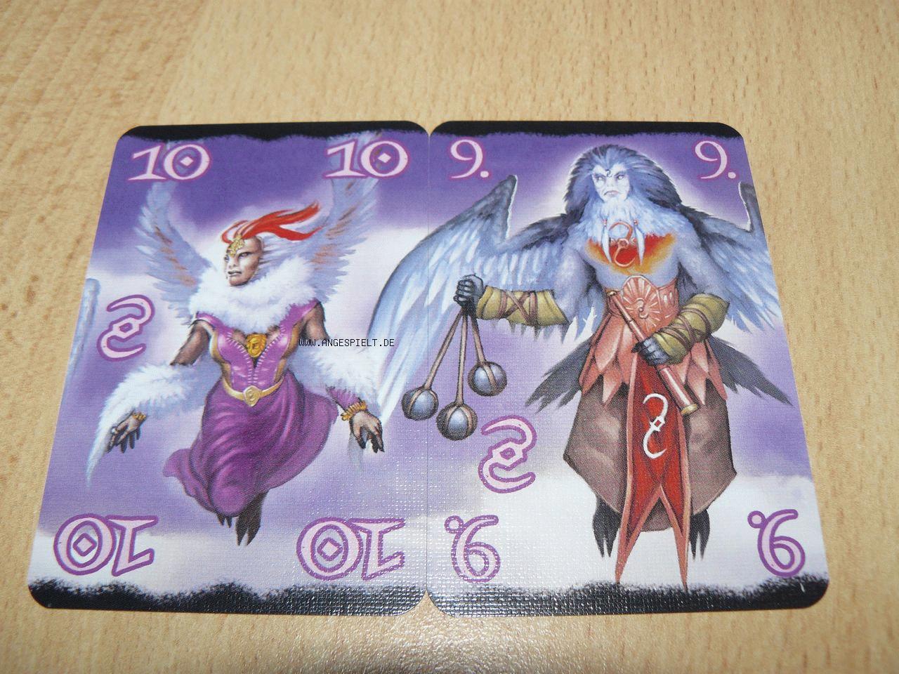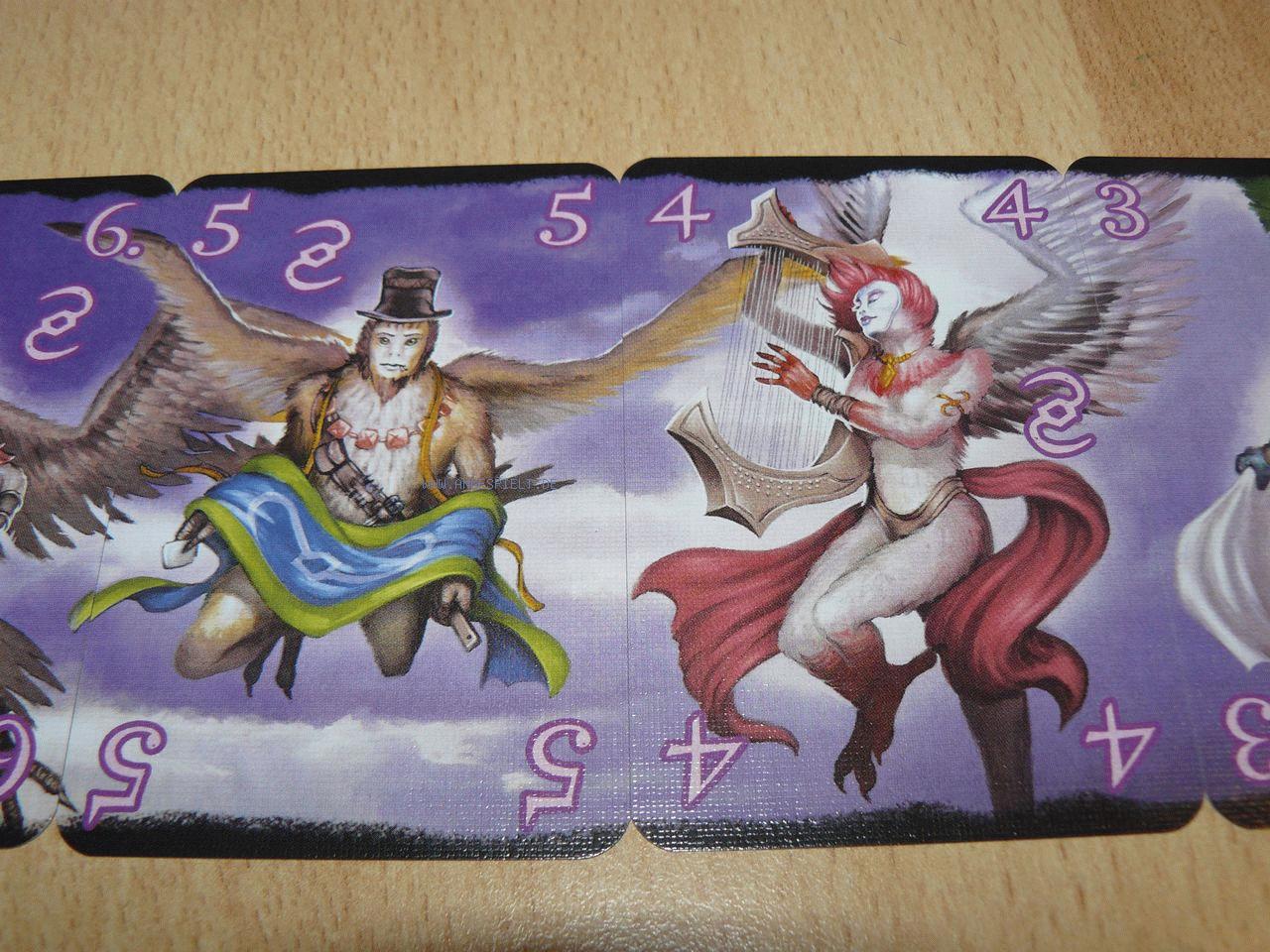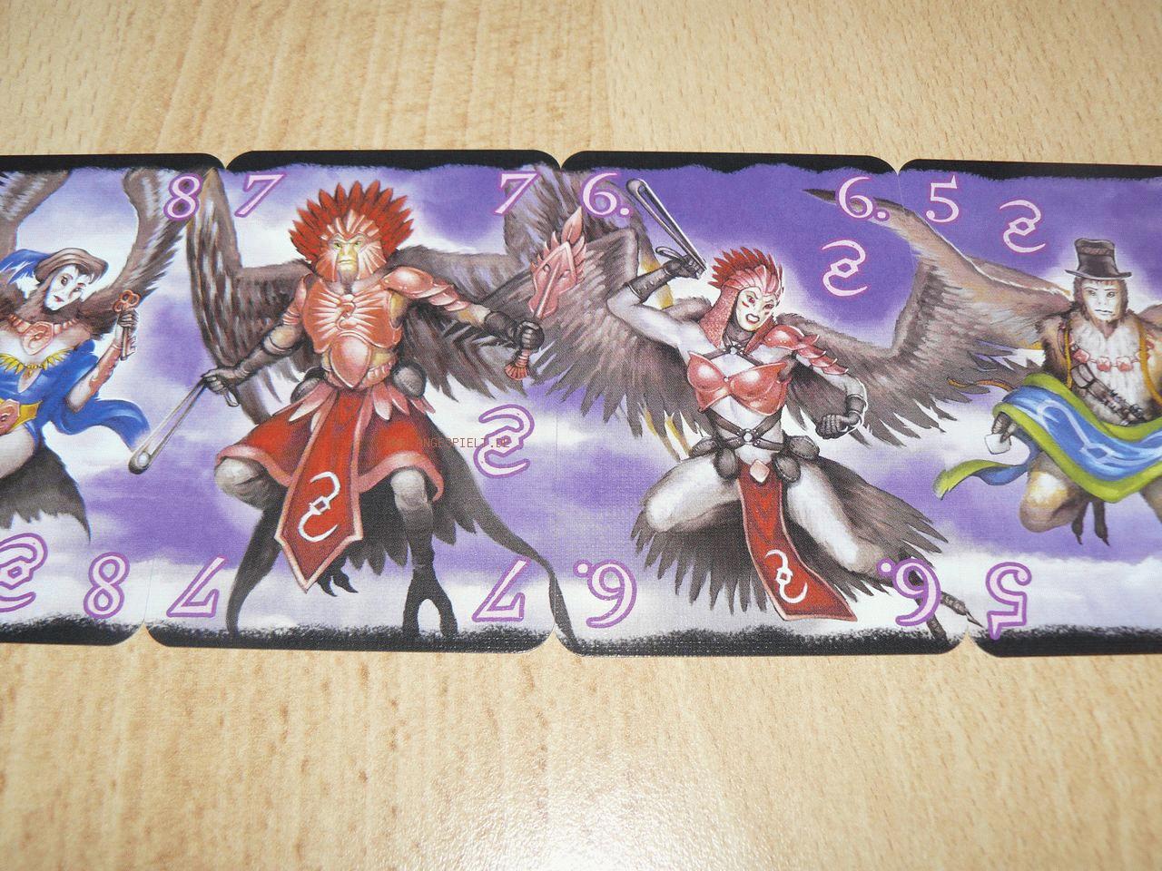 Die neue Grafik ist wirklich gelungen und weist mehr Ähnlichkeiten zu Wizard auf, als zu den 7 Siegeln. Jetzt treiben sich auf den Karten gelbe Zentauren, lila Vogelmenschen, rote Magier, blaue Wasserwesen und grüne Feen herum. Wie bereits bei Wizard ergeben die Karten nebeneinander gelegt und absteigend in ihrer Farbe geordnet jeweils ein großes Bild.