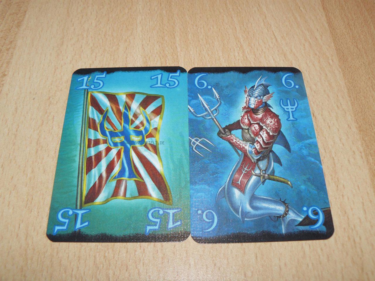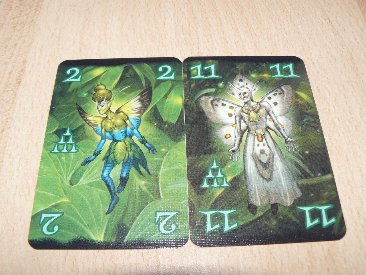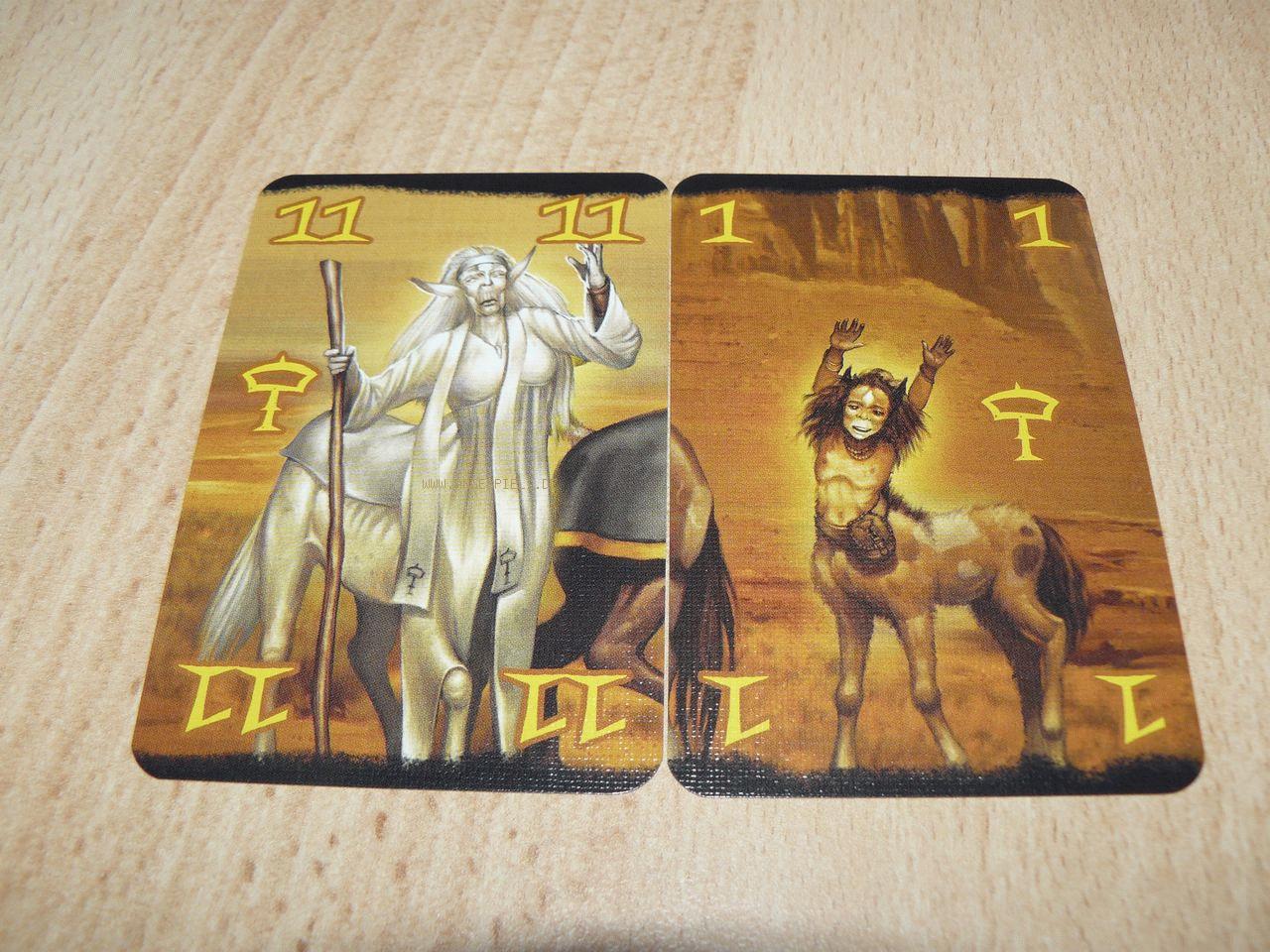 Die neue Grafik ist wirklich gelungen und weist mehr Ähnlichkeiten zu Wizard auf, als zu den 7 Siegeln. Jetzt treiben sich auf den Karten gelbe Zentauren, lila Vogelmenschen, rote Magier, blaue Wasserwesen und grüne Feen herum. Wie bereits bei Wizard ergeben die Karten nebeneinander gelegt und absteigend in ihrer Farbe geordnet jeweils ein großes Bild.